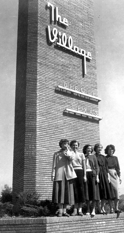 1953: Queen candidates of the very first Diboll Day pose with the newly completed sign marking The Village shopping center, the site of many early Diboll Day activities. From the left are Frances Wells, Mary Virginia Smith, Annette Courtney, Martha Honea, and Ethel Sullivan. Annette Courtney's team would raise the most money and she would be crowned queen. Joe C. Denman Jr. was the first Booster Club president.