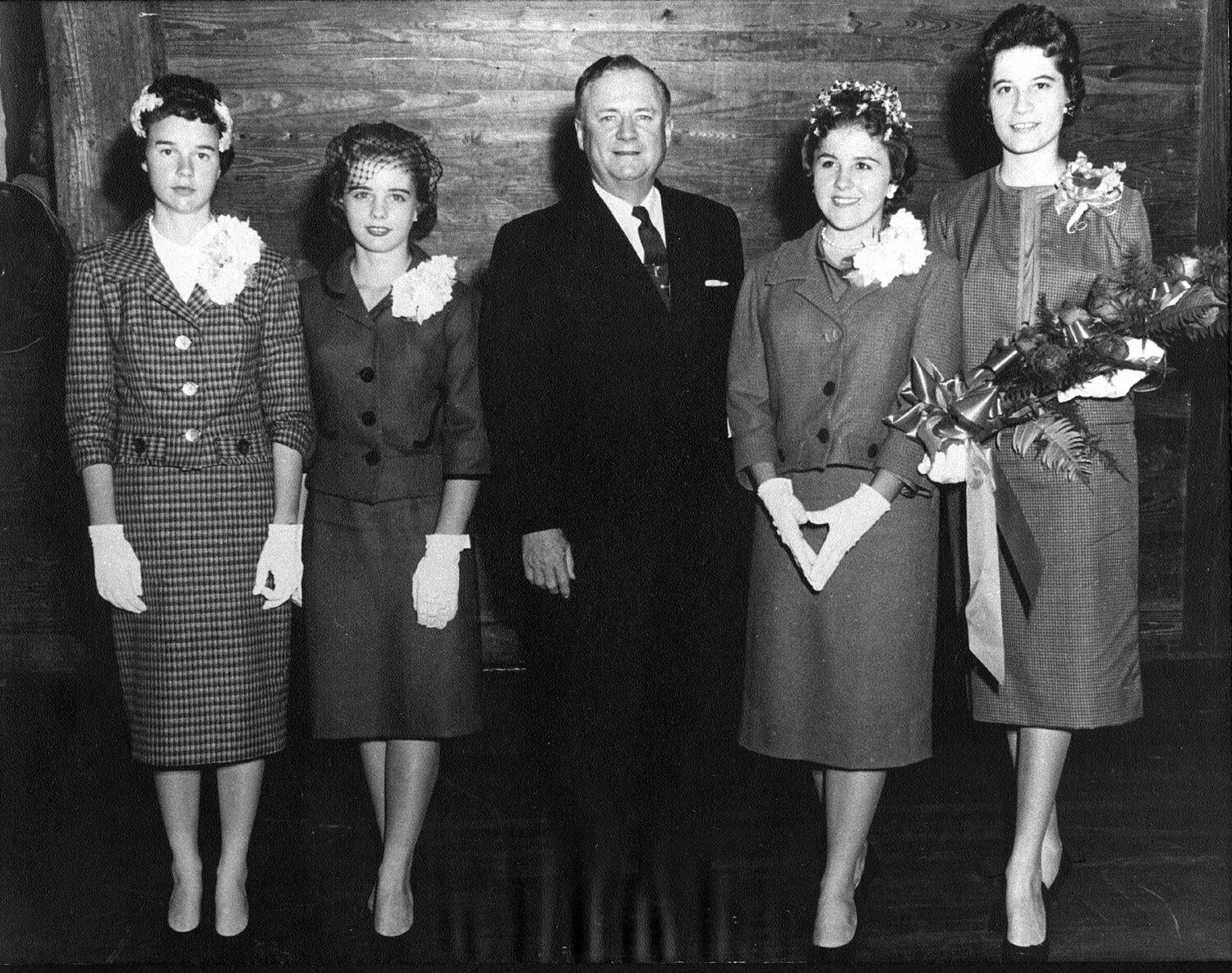 1960: Texas Governor Price Daniel spoke at the festivities and posed with the queen candidates. From left to right, Rita Kay Hutto, Joan Wells, Mary Etta Clark, and Queen Jo Ann Hendrick.