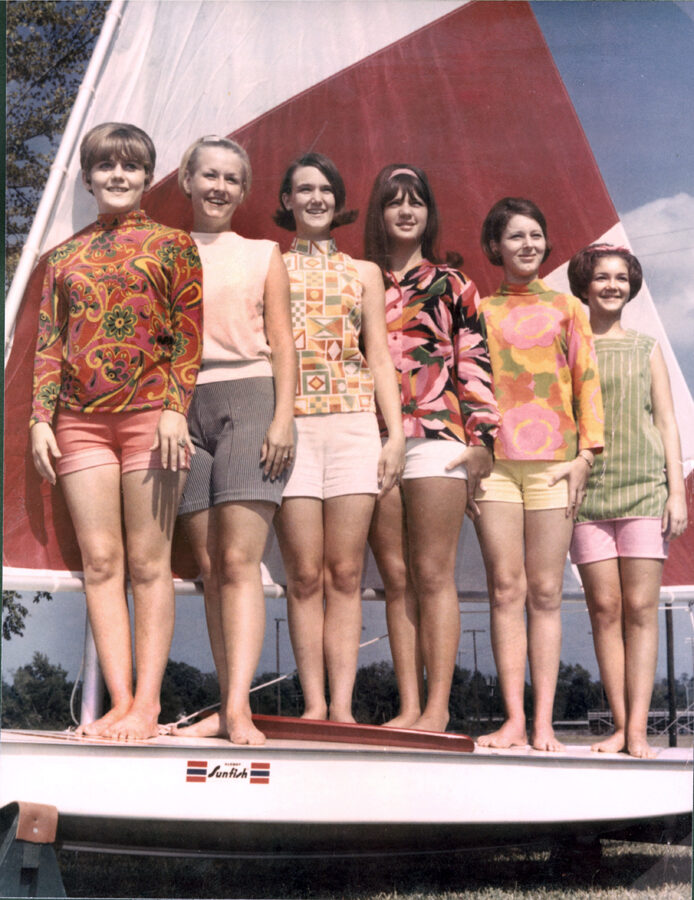 1968: The contestants of 1968 posed on a sailboat, one of this year's prizes. Left to right are Janice Watson, Linda Chandler, Fran Rich, Deanna Ramsey, Kathy Baskette, and Suzanne Stubblefield. Kathy Baskette received the crown. Fran Rich (McClain)'s daughters were later candidates, April in 1992 and Lisa, crowned queen, in 1998. 1968 winner Kathy Baskette's sister, Suzanne, was a candidate in 1974.