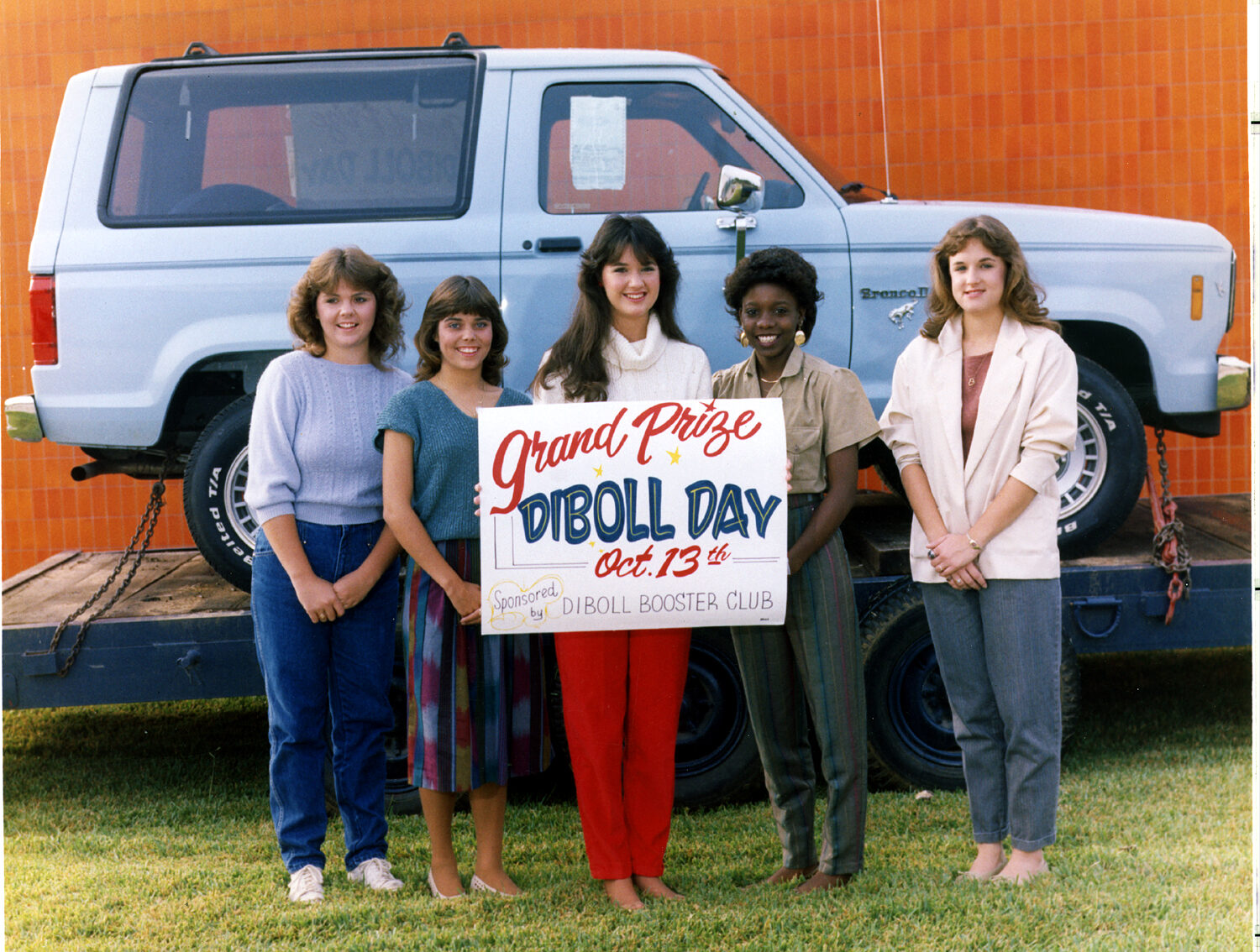 1992: 1992's Diboll Day Queen candidates pose with 1990's Queen Angela Ferguson, third from left. Left to right are April McClain, Erin Kellam, (Furgurson), Jennifer Sweeny, Robin Barger, and sponsor Lisa Burkhalter. Jennifer Sweeny was crowned queen. Nearly $341,000 was raised this year, the first time to surpass $300,000. Gary Martz was Booster Club president.