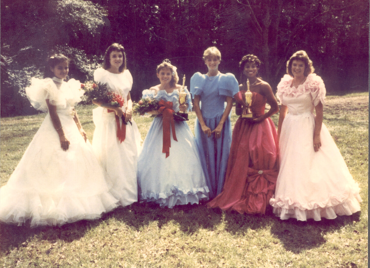 1984: Queen and Court Autumn Capps, Rulaine Capps, Emily Cheavens, Lisa Gordon, and Queen Theresa Sweeny.
