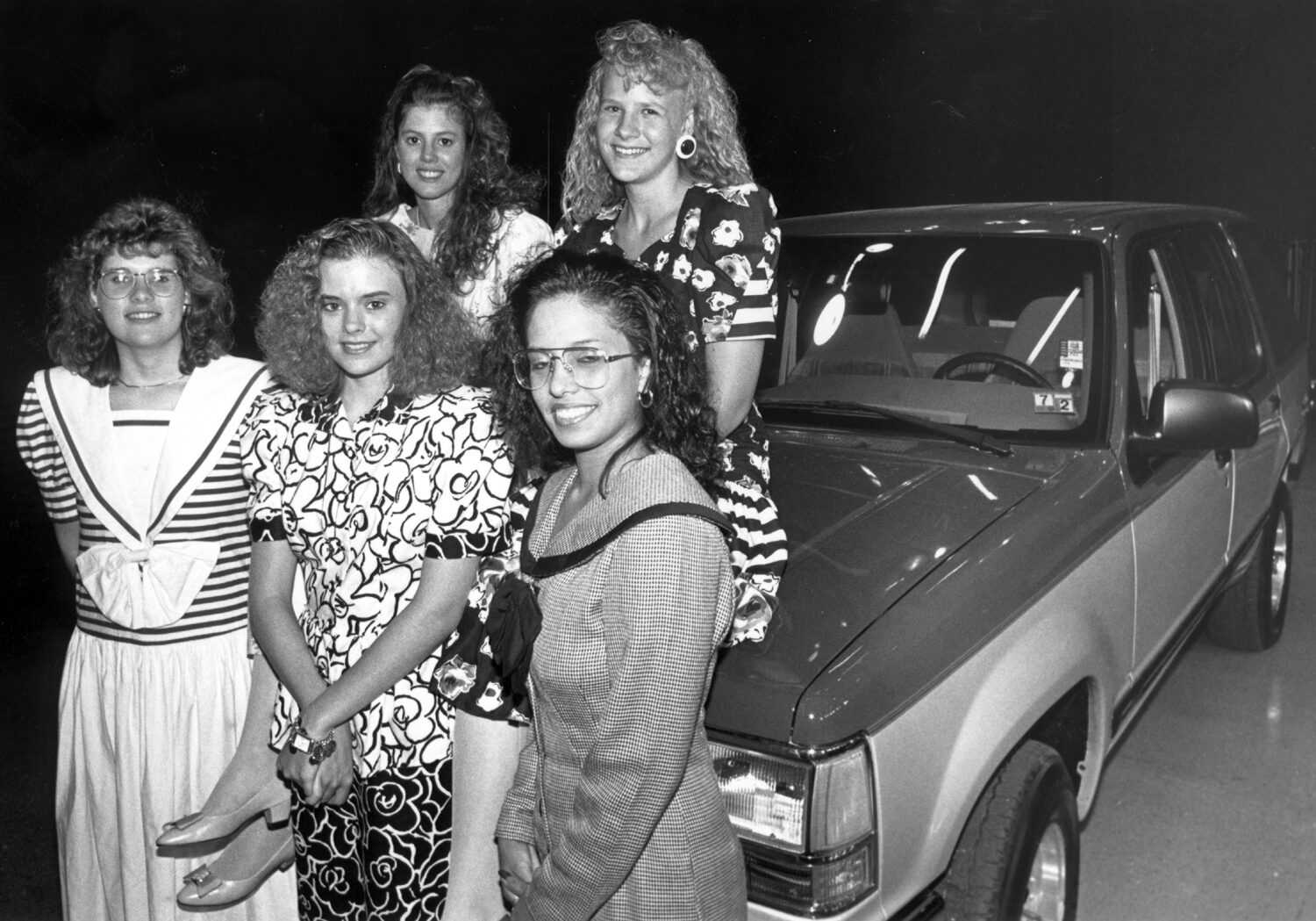1990: Diboll Day Queen candidates (front row): Kerry Hannah, Janee Jones, and Lisa Suarez. Back row: Angela Furgurson and JonAnna Bradford. Angela Furgurson was crowned queen.