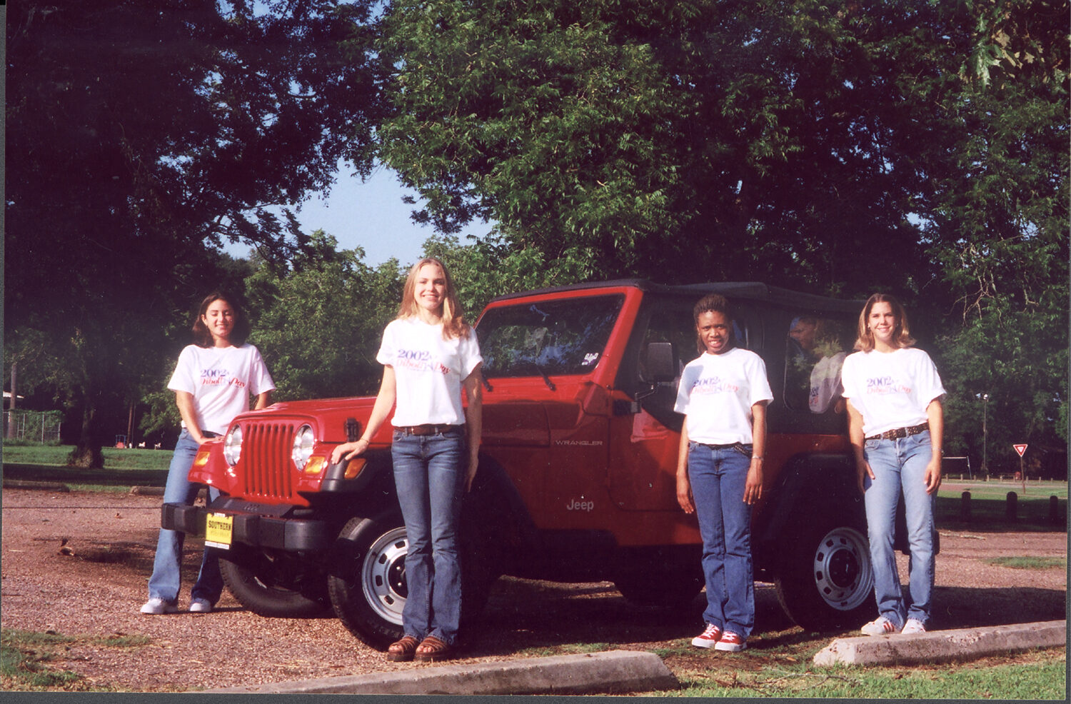2002 Diboll Day Queen candidates are shown here with the grand prize Jeep Wrangler. Left to right: Mandy Smith, Ashlei Burchfield, Amanda Jackson, and Heather Warren. Amanda Jackson was crowned queen.