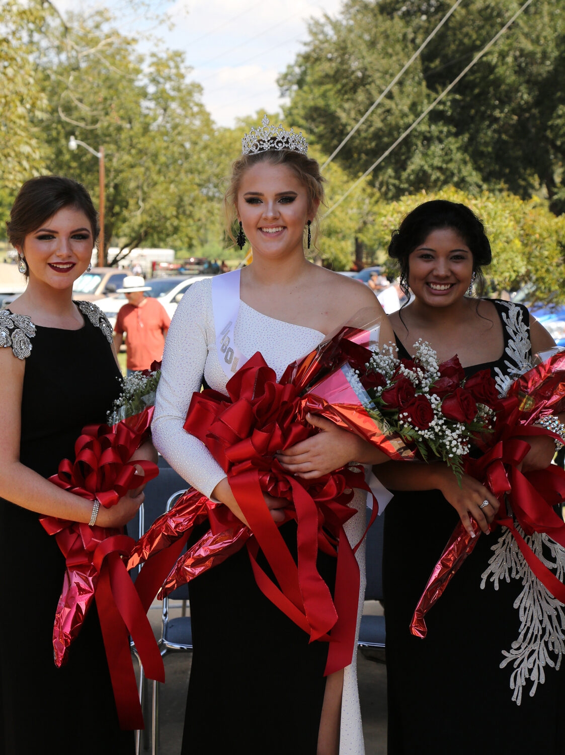 2016: Contestant Tristan Rice, Queen Jo Lynn Baker, and contestant Victoria Esteves pose after the coronation ceremony at Diboll Day 2016.