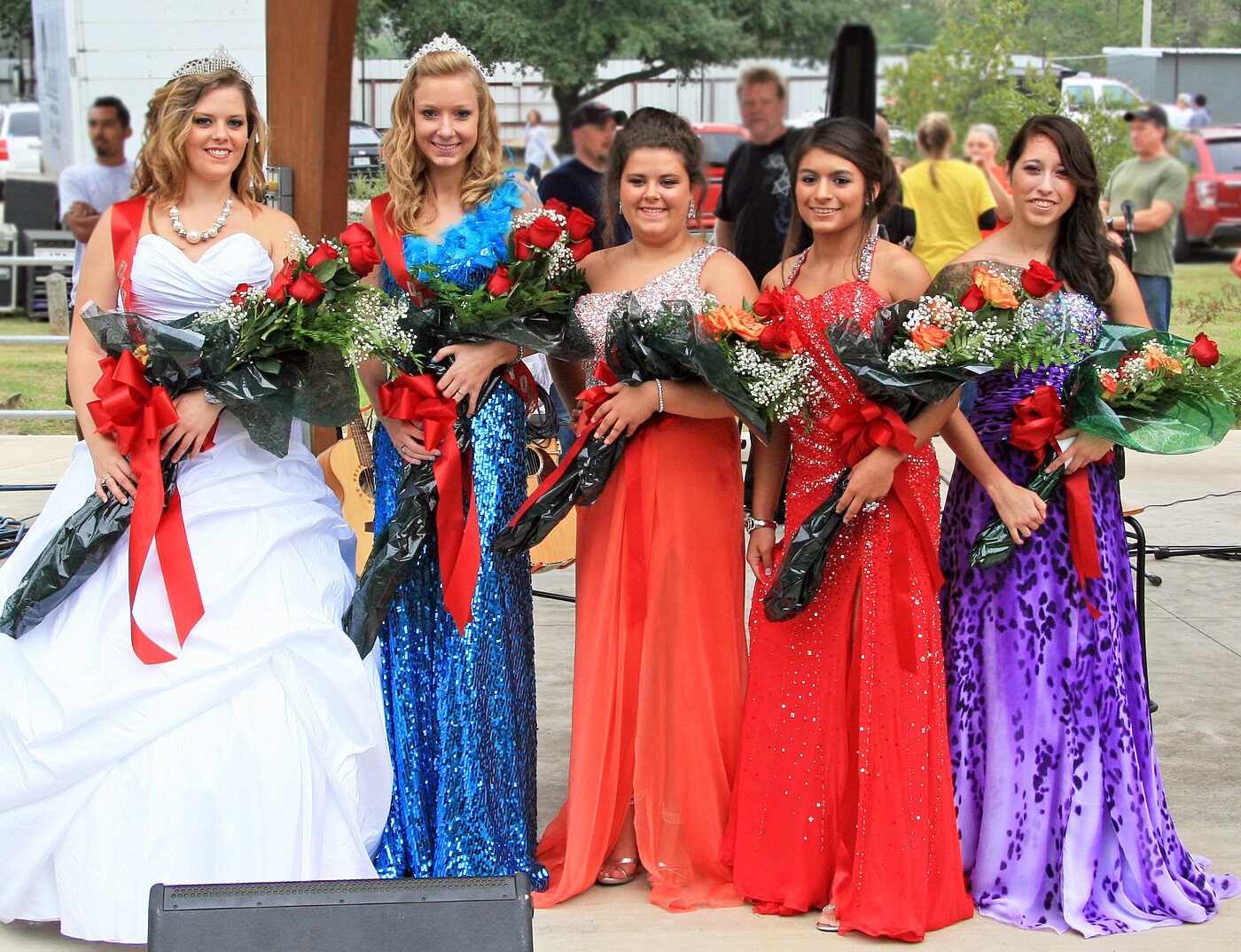 2012 Queen Emily Parish (in the blue dress, second from left) poses with her fellow contestants Courtney Shivers, Audrey Tamez, and Isabella Tamez. To Emily's right is 2010 Queen Callie Shivers.